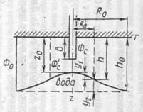 Ф0, Фс, Фс' - потенциалы скорости фильтрации на соответственно условном контуре питания радиуса R0, контуре скважины радиусом гс, условном контуре внутренней зоны притока радиусом R0' =h0; У1, У2 - расстояние от точки конуса с координатами (R0,h) до соответственно вершины конуса и ВНК; Z0 - ордината вершины конуса; b - величина вскрытия пласта