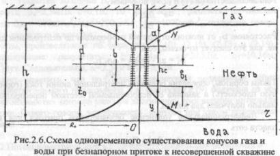 При разработке нефтегазовых залежей с подошвенной водой или нефтяных оторочек возникают сложные гидродинамические задачи по определению предельных безводных и безгазовых дебитов, предельных депрессий, наивыгоднейшего интервала вскрытия нефтяной оторочки относительно ГНК и ВНК, безводного периода, безводной нефтеотдачи на момент полного обводнения или загазовывания скважин. Приближенная теория стационарных конусов применительно к подгазовым нефтяным залежам с подошвенной водой была впервые разработана М.Маскетом и И. А.Чарным. Дальнейшее развитие она получила в работах А.К.Курбанова, П.Б.Садчикова, А.П.Телкова, Ю.И.Стклянина, Р.Чанея, И.Лукерена и др. Формулы Мейера, Гардера и П.М.Шульги для определения предельного безводного и безгазового дебитов исходят из теории безнапорного притока к несовершенной скважине и дают весьма приближенные завышенные против действительных предельных значения, т.к. они фиксируют дебиты уже в момент прорыва газа или воды. Рассмотрим приближенные, но более обоснованные методы.