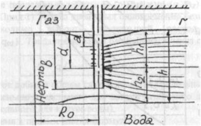 Расчеты, произведенные по формулам (2.10), (2.12), (2.13) и (2.19), дают следующие результаты: b=14,84м; z0=20,33m, b1=10,16м; Q=9,87м3/сут. Следовательно, а=2,34м и у=10,17м. Следует заметить, что полученный расчетный предельный дебит больше действительного предельного, т.к. формула (2.19) получена из условия «устойчивости» конусов уже при достижении ими вершин интервала перфорации. Строго говоря, устойчивость конусов при таком положении невозможна.