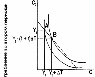 На рисунке 2 приведена диаграмма Фишера, показывающая влияние снижения налогов в первый период на положение потребителя, при условии, что объем государственных закупок не сокращается ни в первый, ни во второй период. В первый период правительство сокращает налоги на DТ и финансирует это сокращение путем займов. Во второй период правительство должно поднять налоги на (1+r)DТ, чтобы возвратить долг и выплатить накопленные проценты. В итоге, изменение бюджетно-налоговой политики повышает доход потребителя на DТ в первый период и уменьшает его на (1 + r)DТ во второй. Набор возможностей потребителя остается неизменным, так как приведенная величина дохода потребителя остается той же, что и до изменения бюджетно-налоговой политики. Поэтому потребитель выбирает тот же самый уровень потребления, который он бы имел без снижения налогов, что предполагает рост личных сбережений на величину снижения налога.
