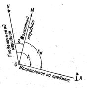 Магнитным азимутом Am направления называется горизонтальный угол, измеряемый по ходу часовой стрелки (от 0 до 360 градусов) от северного направления магнитного меридиана до определяемого направления, (рис.1). Магнитные азимуты определяются на местности с помощью угломерных приборов, у которых имеется магнитная стрелка (компасов и буссолей). Использование этого простого способа ориентирования направлений невозможно в районах магнитных аномалий и магнитных полюсов.