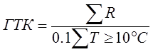ΣT- сумма среднесуточных значений температуры воздуха больше 10 °С.