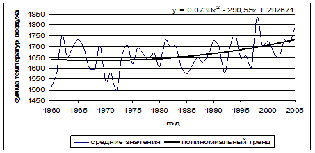 На рисунке 1 приводится временной ход сумм температур за период >10 ºС, осредненных по исследуемой территории, а также линия осреднения полиномом второй степени, которая аппроксимирует изменение сумм температур во времени.