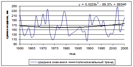 На рисунке 2 приводится временной ход сумм осадков, осредненных по исследуемой территории, а также линия осреднения также полиномом 2й степени, которая показывает изменение сумм температур во времени.