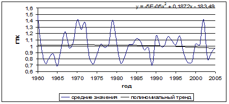 По станциям, выбранным для настоящего исследования по выше описанной методике был проведен расчет индекса ГТК. На рисунке 3 приводится временной ход индекса ГТК, осредненный по исследуемым станциям, а также линия полиномиального тренда, которая показывает изменение индекса во времени.