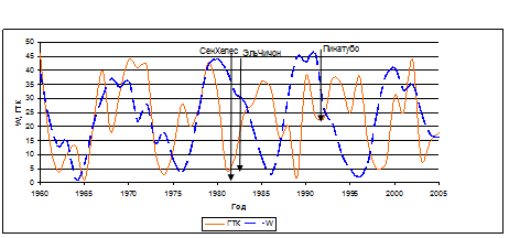 При анализе изменения ГТК во времени, можно заметить, что выявляются некоторые периодичности хода индекса. По произведенному спектральному анализу можно сказать, что индекс ГТК имеет 11-летний цикл, и менее выражены 6 и 9-летние циклы. Этот вывод наводит на мысль о том, что, вероятно, существует связь периодичности ГТК с солнечной активностью. В качестве характеристики, которая дает представление о солнечной активности наиболее часто используют числа Вольфа. Данная ранжированная зависимость представленная на рисунке 4.