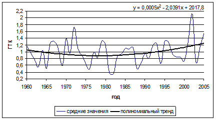 Коэффициент Спирмана равный 0,27 показывает, что в целом влияние солнечной активности в 30% случаев оказывает влияние на индекс ГТК. В других случаях наблюдаются отдельные аномалии года, т.е. выбивания из совместного ритма. Так же немало важным аспектом является, что в период обработки данного массива данных попадает на 3 циркуляционные эпохи до 1968 меридиональная (С), 1969-1981 форма восточной циркуляции (Е), а с 1991 началась эпоха западного переноса (W) [7].