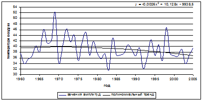 Большие внутригодовые различия значений температуры — следствие континентальности климата — способствуют формированию на территории России зоны рискованного земледелия, для которой характерна значительная неустойчивость урожаев. Для современного изменения климата характерно уменьшение годовой амплитуды температуры, что ведет к уменьшению континентальности климата на территории земледельческой зоны Западной Сибири. На рисунке 8 приводится временное изменение годовой амплитуды температуры, осредненной по исследуемой территории, а также линия осреднения, которая показывает изменение времени.