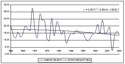 На рисунке 9 приводится временное изменение среднемесячной температуры за январь, осредненный по исследуемой территории, а также линия осреднения, которая показывает изменение времени.