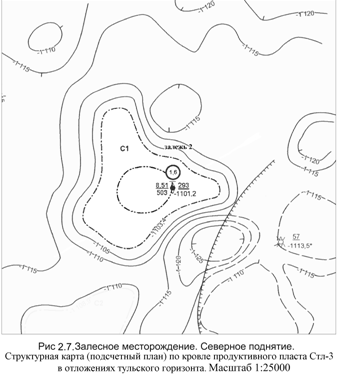 Залежь в отложениях тульского горизонта контролируется замкнутой изогипсой -1100 м, определяющая размеры Северного и Южного поднятия по отражающему горизонту "У".