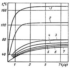 Рис. 22- Изменение температуры на забоях скважины во времени при электропрогреве: 1 - 21 кВт; 2 - 10,5 кВт; 3, 4 - 21 кВт; 5, 6, 7 - 10,5 кВт.