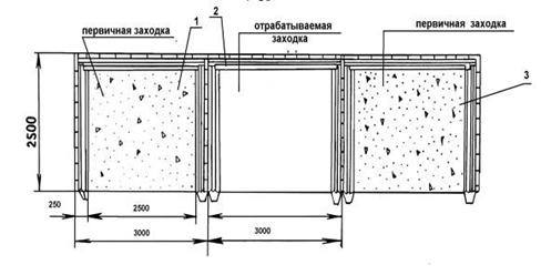 Рис. 5. Технология выемки пластов для неустойчивых руд и вмещающих пород: 1, 3 – закладка, 2-крепление заходки