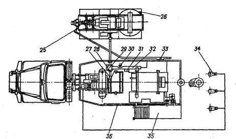 В состав установки входит также электрооборудование 34, узел управления и освещения шасси 36, установка запасного колеса и площадки оператора 35.