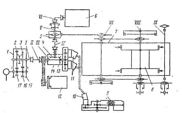 1-коробка отбора мощности; 2, 3-шестерни коробки отбора мощности; 4, 13-шестерни конические; 5-звездочка цепной передачи; 6-промывочный насос; 7-лебедка; 8-подъемный барабан; 9-ротор; 10-гидроротор; 11-масляный насос; 12-компрессор; 14-раздаточный редуктор; 15-раздаточная коробка; 16, 17-шестерни раздаточной коробки; I-ведущий вал; II, IV, VI-карданные валы; III-первичный вал; V-вал цепной передачи;VII-вал силовой передачи; VIII-вал подъемного барабана;