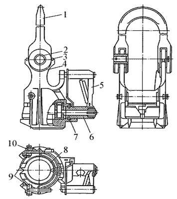 1 - серьга; 2 - палец; 3 - шплинты; 4 - корпус; 5 - рукоятка; 6 - направляющая втулка; 7 - штырь; 8 - челюсть; 9 - направляющие; 10 - болт.