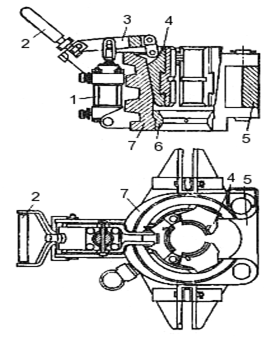 1 - гидроцилиндр; 2 - рукоятка; 3 — рычаг; 4 - клиновая подвеска; 5 - створка; 6 - центратор; 7 – корпус