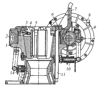 1 - корпус автомата; 2 - червячное колесо; 3 - клиновая подвеска; 4 - корпус клина; 5 - плашка; 6 - опорный фланец; 7 - водило; 8 - вал вилки включения маховика; 9 — электроинерционный привод; 10 — ось балансира; 11 — направление клиновой подвески; 12 - центратор; 13 - пьедестал центратора; 14 - фиксатор центратора.