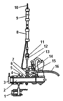 1 - стопор; 2 - ключ; 3 - створка; 4 — упор; 5 - ограничитель ключа и стопора; 6 - болт регулировочный; 7 — рукоятка подъема; 8 — гидроподъемник; 9 - амортизатор; 10 - серьга; 11 - винт; 12 - подвеска; 13 — гидрораскрепитель; 14 - ограничитель крутящего момента; 15 - рукоятка переключения скоростей; 16 – гидрорукав