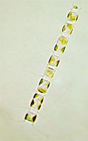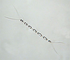 Chaetoceros laciniosus - его отличают изогнутые, как длинные щипцы, конечные пары хет колонии |