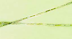 Диатомовым водорослям, в их тяжелых доспехах из кремния, не утонуть - трудно. Жгутиков для движения у них нет. У них есть только один способ замедлить погружение - увеличенная поверхность клетки. Для этой цели обычно служат выросты панциря - длинные колючие щетинки нужны хетоцеросам не только для защиты, они еще и помогают парить в воде. На примере хетоцероса мы видим и другой способ увеличения поверхности - образование колоний-цепочек - десятки клеток плавают, сцепленные друг с другом. Поделилась одна из них - и на одну клетку в колонии стало больше. Так же увеличивает поверхность похожая на лестницу колония диатомеи хемиаулюса Hemiaulus hauckii.