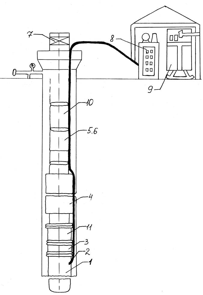 Рис. 1. 1 – двигатель; 2 – кабель; 3 – гидрозащита; 4 – насос ЭЦН 5,6 – обратный и сливной клапаны; 7 – устьевое оборудование; 8 – автотрансформатор; 9 – станция управления; 10 – НКТ; 11 – модуль всасывающий.
