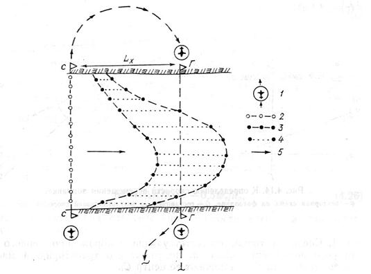 1 – маршрут полета самолета, 2 – линия положения поплавков в момент сброса, 3 – линия положения поплавков в моменты аэрофотосъемок, 4 – траектории поплавков, 5 – направление течения.