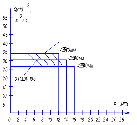 На значениях подачи отметим интервалы регулирования расхода. Найдем потери давления, зависящие от глубины. Они равны потерям в ЛБТ, СБТ, УБТ, кольцевом пространстве между ЛБТ и стенками скважины, СБТ и стенками скважины, УБТ и стенками скважины, замках, кольцевом пространстве между замками и стенками скважины.