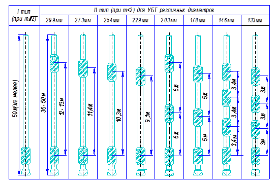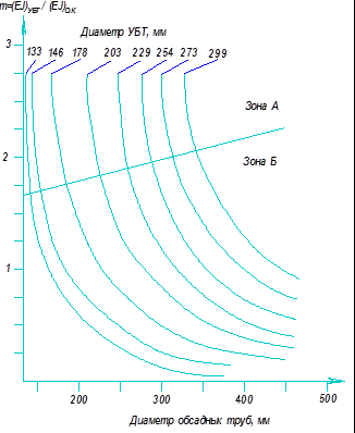 Решение вопроса о выборе конкретного типа КНБК заключается в определении величины m для применяемого диаметра УБТ и диаметра намеченной к спуску обсадной колонны и нахождение по номограмме (см. рис.1) зоны, в которой находится найденная величина m. Если данная m располагается в зоне А номограммы, применяют КНБК I типа, а если Б – II типа (см. рис.2).