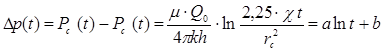Методы обработки результатов гидродинамических исследований скважин основаны на различных математических моделях в зависимости от типа коллектора и реологических свойств пластовой нефти. Распространенным способом определения параметров пласта является обработка КВД в полулогарифмических координатах. Тогда изменение забойного давления во времени может быть представлено в виде: