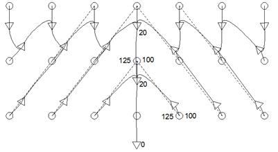 Клиновидная схема инициирования (рис. 1) с использованием устройств СИНВ-П-30. Она обеспечивает хорошее дробление и компактный развал взорванной среды. Угол клина может быть уменьшен или увеличен за счет изменения времен поверхностных межрядных и межскважинных замедлений.
