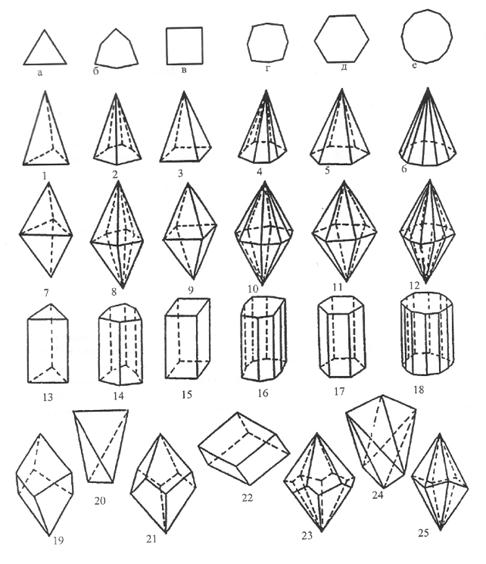 13–25 призмы; 13–тригональная, 14–дитригональная, 15–тетрагональная, 16–дитетрагональная, 17–гексагональная, 18–дигексагональная, 19–тригональный трапецоэдр, 20–тетраэдр, 21–тетрагональный трапецоэдр, 22–ромбоэдр, 23–гексагональный трапецоэдр, 24–тетрагональный скаленоэдр, 25–тригональный скаленоэдр