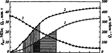 / — накопленная добыча газа, млрд. м3; 2 — то же конденсата, млн. т; 3 — средневзвешенное пластовое давление, МПа. Вертикальной штриховкой обозначен период максимальных годовых отборов конденсата, горизонтальной — газа