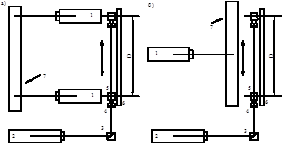а) когда нивелир перемещается вдоль растровой меры, б) когда рейка перемещается вдоль растровой меры: 1-исследуемый нивелир, 2-лазерный интерферометр, 3-разворачивающий блок интерферометра, 4-отражатель интерферометра, 5- растровый измерительный преобразователь, 6-стеклянная растровая мера, 7- нивелирная рейка.