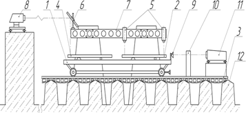 Метод исследования системы "нивелир – рейка" на компараторе – основывается, как и в предыдущем методе, на компарировании или сравнении. Для проведения калибровки используются два эталонных средства измерения превышений: Это лазерный интерферометр (погрешность 1мкм+1ppm) и инварный жезл (погрешность 10мкм). Метод заключается в том, что перемещение рейки и эталонного жезла осуществляется в горизонтальном положении по направляющим рельсам на подвижной тележке. Основой данного метода является существенно усовершенствованный оптико-механический компаратор МИИГАиК (рис.4). На изолированных "малых" фундаментах (12) с интервалом в 1м закреплены рельсы (3), выставленные в горизонт и по азимуту. На рельсах установлена подвижная каретка (1). На "больших" фундаментах, расположенных за рельсовым путем, закреплена направляющая (7) длиною 3,5м, на которой располагаются микроскопы (5), имеющие возможность перемещения по этой направляющей. Направляющая с микроскопами располагается над рельсовым путем. На расстоянии 25м по направлению рельсов на бетонной основе устанавливается нивелир (8); с другой стороны – лазерный интерферометр (11) и блок опорного канала (10), для измерения интерферометром на подвижной каретке закреплен уголковый отражатель (9). Для разворота изображения рейки на направляющей закреплено наклонное зеркало (6), которое имеет возможность юстировки. Для проведения измерений на каретку одновременно или по очереди устанавливаются инварный жезл (4) и исследуемая рейка (2). Если за эталонное средство принимается только инварный жезл, то температура следует измерять с точностью порядка 0,10С. При использовании интерферометра, как правило, параметры окружающей среды берутся с датчиков интерферометра.