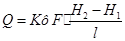 В результате проведенных исследований Дарси установил, что количество воды, профильтровавшейся через песок в единицу времени (расход, О), прямо пропорционально разности уровней воды в пьезометрических трубках (∆Н=Н2—Н1), площади поперечного сечения цилиндра (F) и некоторому коэффициенту пропорциональности (К) и обратно пропорционально высоте слоя песка (I). Оказалось, что коэффициент К зависит от свойств песка и его стали называть коэффициентом фильтрации (Кф). Эта зависимость получила название закона Дарен и обычно записывается в следующем виде (1):