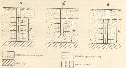Приток воды к ней происходит по всей поверхности соприкосновения стенок выработки с водоносным горизонтом (рис. 1, а). Если же выработка не доходит до водоупора, она называется несовершенной по степени вскрытия водоносного горизонта (рис. 1, б). Зачастую выработки закрепляются от обрушения, цементируются скважины оборудуются обсадными трубами, фильтрами и т. п. Естественно, что приток воды в такие выработки затруднен и их называют несовершенными по характеру вскрытия водоносного горизонта.Основные уравнения притока воды к водозаборам (скважинам и дренам) будем выводить при условии совершенства выработок.
