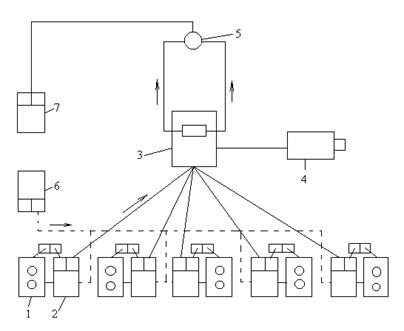 1- цементно-смесительная машина 2СМН-20; 2- цементировочный агрегат ЦА-320М; 3- блок- манифольда БМ-700; 4- станция контроля цементирования СКЦ-2М; 5- цементировочная головка; 6- ЦА для подачи воды; 7- ЦА для начала продавки.
