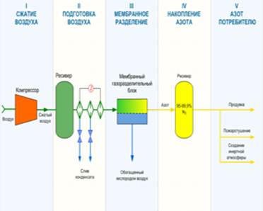 Принцип работы установки азотного пожаротушения основан на инертных свойствах создаваемой воздушной смеси с содержанием азота 95–99%. При таком содержании азота в воздухе процесс горения становится невозможным. Газообразный азот, производимый газоразделительным мембранным блоком азотной установки пожаротушения, подаётся под давлением в ресивер, объём которого рассчитывается исходя из объема помещений и резервуаров, пожаробезопасность которых обеспечивает установка[10].