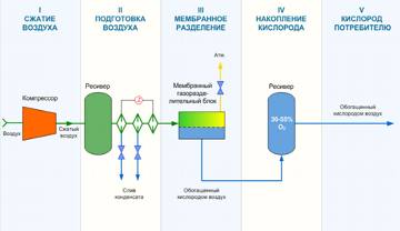Разделение смеси с помощью мембранной технологии происходит за счет разницы парциальных давлений на внешней и внутренней поверхностях половолоконной мембраны. Газы, «быстро» проникающие через полимерную мембрану (например, H2, CO2, O2, пары воды, высшие углеводороды), поступают внутрь волокон и выходят из мембранного картриджа через один из выходных патрубков. Газы, «медленно» проникающие через мембрану (например, CO, N2, CH4), выходят из мембранного модуля через второй выходной патрубок.