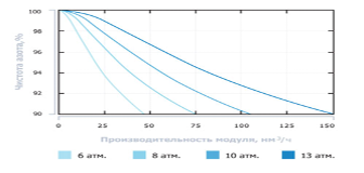 Производительность мембранного модуля в зависимости от чистоты азота при различных давлениях |