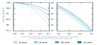 Чистота азота в зависимости от отношения потоков на входе и выходе мембранного модуля при различных давлениях |