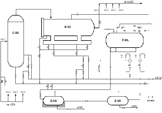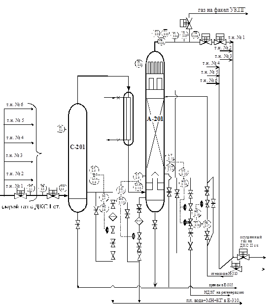 4,6 МПа поступает через входной арматурный узел в сепаратор С-201, рисунок 4.3, из сепаратора, пройдя теплообменник Т-202, газ нагревается до температуры 17°С и поступает в нижнюю часть абсорбера. При повышении или понижении давления газа на входе в технологическую линию сигнал через ЭКМ и управляющий комплекс УВК поступает на закрытие пневмокранов на входе газа в сепаратор и выходе газа из абсорбера и открытие крана Ду=150 на факел. На рисунке 4.3 изображена принципиальная схема осушки газа.