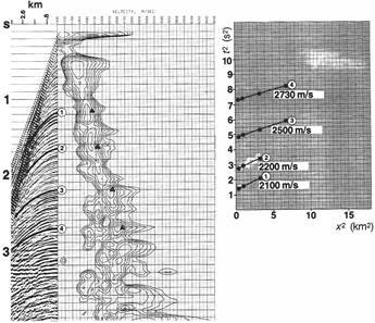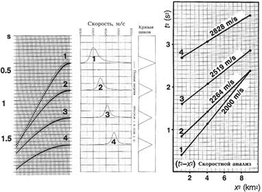 Это уравнение описывает линию на поверхности (t2, x2). Наклон линии равен 1/v2st, а величина, при которой происходит пересечение х = 0, равна t(0). Синтетическая выборка на рис.2 была выведена из скоростной модели на рис.1. На правом изображении рис.2 показаны выбранные времена пробега четырех сигналов при различных выносах в плоскости (t2, x2). Чтобы найти скорость суммирования для данного сигнала, точки, соответствующие этому сигналу, соединены прямой линией. Обратная величина наклона (углового коэффициента) – квадрат скорости суммирования. На практике для определения угловых коэффициентов можно использовать аппроксимацию методом наименьших квадратов.