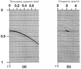 Входная выборка на рис.5а содержит один годограф отражения от плоской границы. Средняя скорость над ОП равна 3000м/с. Предположим, что эта выборка несколько раз исправлена за нормальное приращение и суммирована с применением нескольких постоянных скоростей от 2000 до 4300м/с. На рис.5b показаны результирующие суммарные трассы для каждой скорости на плоскости «скорость – полное вертикальное время». Это изображение называется спектром скоростей. Мы преобразовали данные из области «вынос – полное время пробега» (рис.5а) в области «скорость суммирования – полное вертикальное время» (рис.5b).