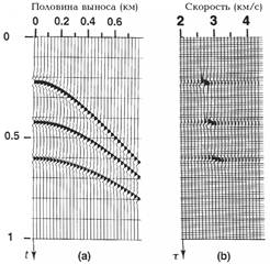 Выборка ОСТ, ассоциированная со слоистой моделью, показана на рис.6а. Исходя из спектра скоростей, выбраны следующие значения для функции скоростей суммирования (рис.5b): 2700, 2800, 3000м/с. Эти величины соответствуют неглубоким, средним по глубине и глубинным отражениям. Спектр скоростей может не только представить функцию скоростей суммирования, но и позволяет различать первичные и кратные отражения.