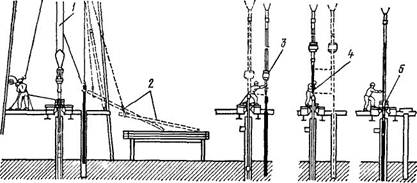 1 — спуск бурильной трубы в шурф для двухтрубки, 2 — подъем соединения с мостков (стеллажа) для труб, 3 — свинчивание вертлюга и ведущей трубы с бурильной трубой, 4 — посадка в муфту бурильной трубы; 5 — наращенная бурильная колонна го това к бурению