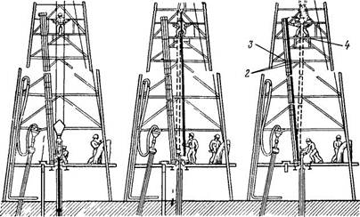 Затем ведущую трубу поднимают (с помощью лебедки) и соединяют с бурильной трубой, которая удерживается в роторе. Наращенную бурильную колонну спускают в скважину и начинается снова процесс бурения. На рис. 1.8 представлена схема процесса наращивания.