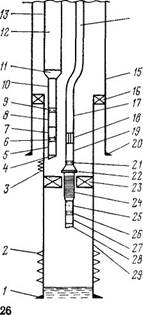 / — башмак обсадной колонны диаметром 177,8 мм; 2,3 — интервалы перфорации для длинной и короткой колонн НКТ; 4, 28 — направляющий безмуфтовый башмак диаметром 60,3 мм с резьбой типа CS для спуска приборов на кабеле; 5 — короткий безмуфтовый переводник с резьбой типа CS; 6 — ниппельный переводник диаметром 60,3 мм типа XN фирмы «Отис» (имеет суженное проходное отверстие); 7 — перфорированная труба-фильтр диаметром 60,3 мм; « — труба НКТ диаметром 50,8 мм; 9, 21 — ниппельный переводник диаметром 60,3 мм типа X фирмы «Отис»; 10, П— НКТ диаметром 60,3 мм; // — переводник НКТ 60,3X73 мм; 12 — НКТ диаметром 73 мм; 13 — короткая колонна НКТ 60.3Х Х73 мм; 14 — длинная колонна НКТ диаметром 73 мм; 15 — обсадная колонна диаметром 219 мм; 16 — подвеска потайной обсадной колонны диаметром 177,8 мм; 18 — устройство типа SSD фирмы «Отис» со скользящей боковой дверцей; 19 — секция защитных труб диаметром 60,3 мм; 20 — башмак обсадной колонны диаметром 219 мм; 22 — локатор (посадочный переводник) типа G-22 фирмы «Бэй-кер»; 23 — пакер типа F-1 фирмы «Бэйкер»; 24 — уплотнительное устройство; 25 — безмуфтовые перфорированные трубы диаметром 60,3 мм с резьбой; 26 — ниппельный переводник диаметром 60,3 мм типа XN; 27 — короткий переводник диаметром 60,3 мм; 29 — потайная колонна диаметром 177,8 мм
