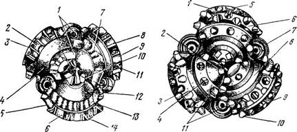 /, 7 — вершина и ocнование зубца 2 — зубец; 3, 6, 8 — шарошки Л' 2, 1 и 3 соответственно, 4—межвенцовая расточка, 5 — выемка между зубцами 9 — промывочная канавка 10 —копьевидная вершина; //, 14— калибрующие поверхности периферийных зубцов с режущими кромками соответственно L и T- образной формы, 12— тыльная сторона шарошки с твердым покрытом 13-направляющая поверхность шарошки.