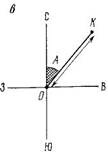 а — пространственный вид; /, 3 — вертикальная (hв) и горизонтальная (hr ) проекции, 2 — положение устья скважины; б, в — вертикальный и горизонтальный профили; О — точка ствола, с которой отклоняют скважину; К — конечная точка бурения; а — угол наклона скважины; А — азимут; h — фактическая глубина скважины